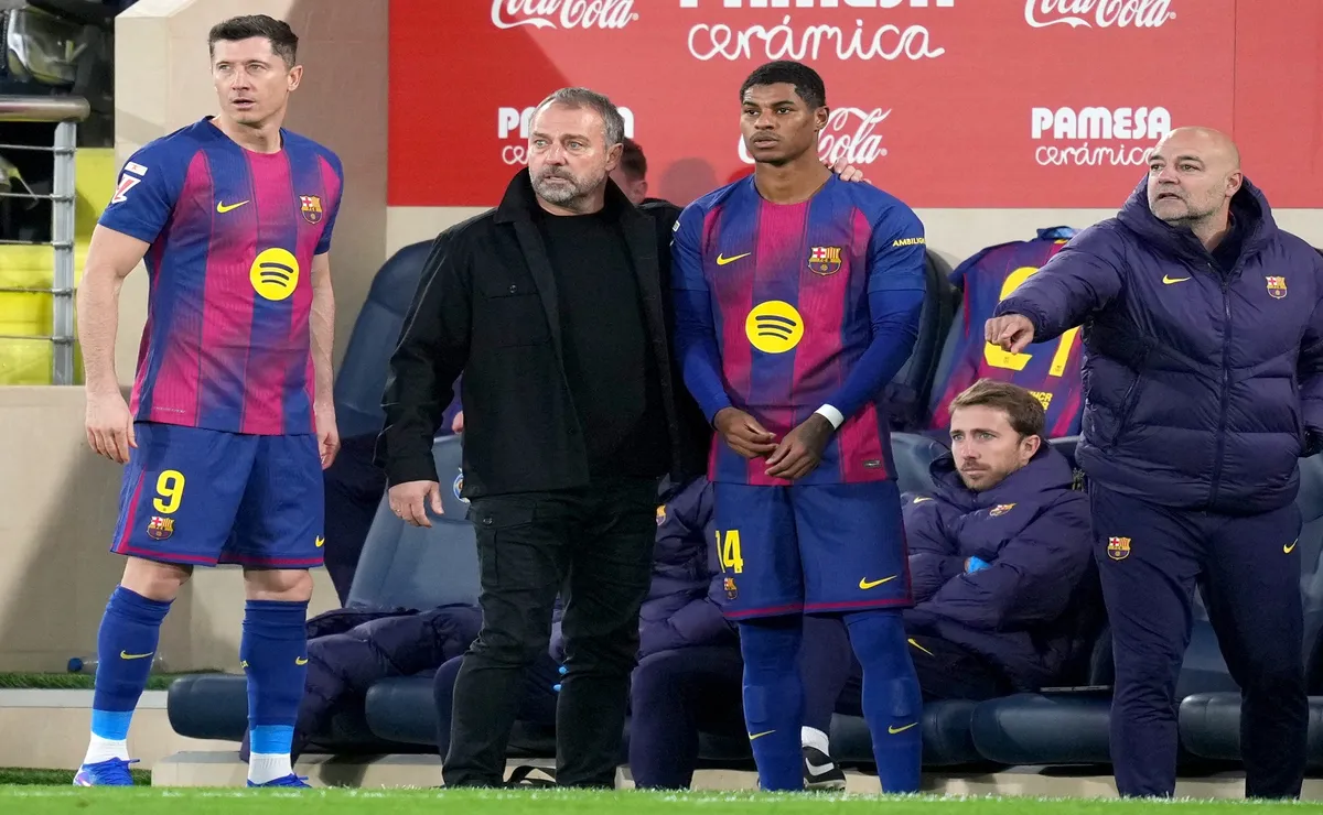 Lewandowski, Flick e Rashford em partida do Barcelona contra o Villarreal em 2025 – Alex Caparros/Getty Images